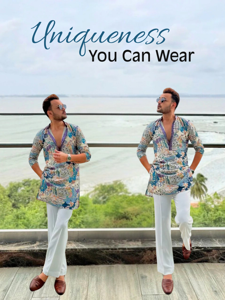 POWDER ASH PRINTED WORK KURTA PAJAMA SET FOR MEN'S